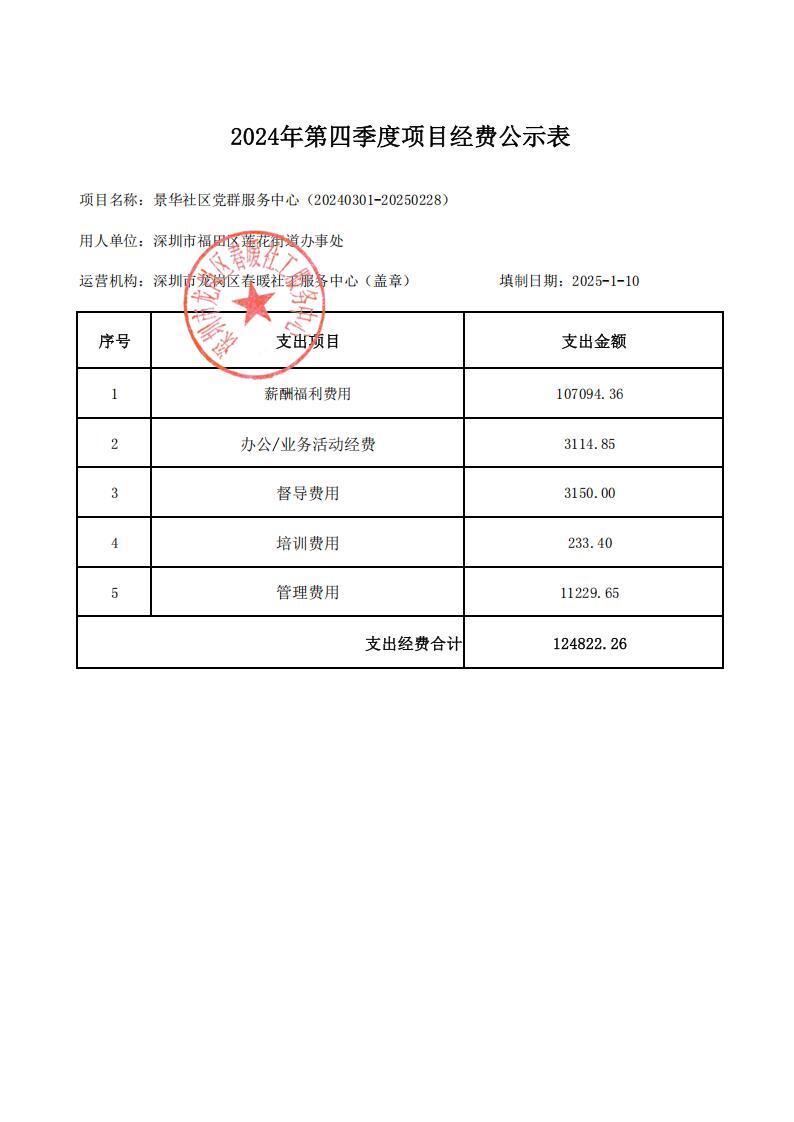 福田区景华社区党群服务中心2024年第四季度项目经费公示表(20240301—20250228)