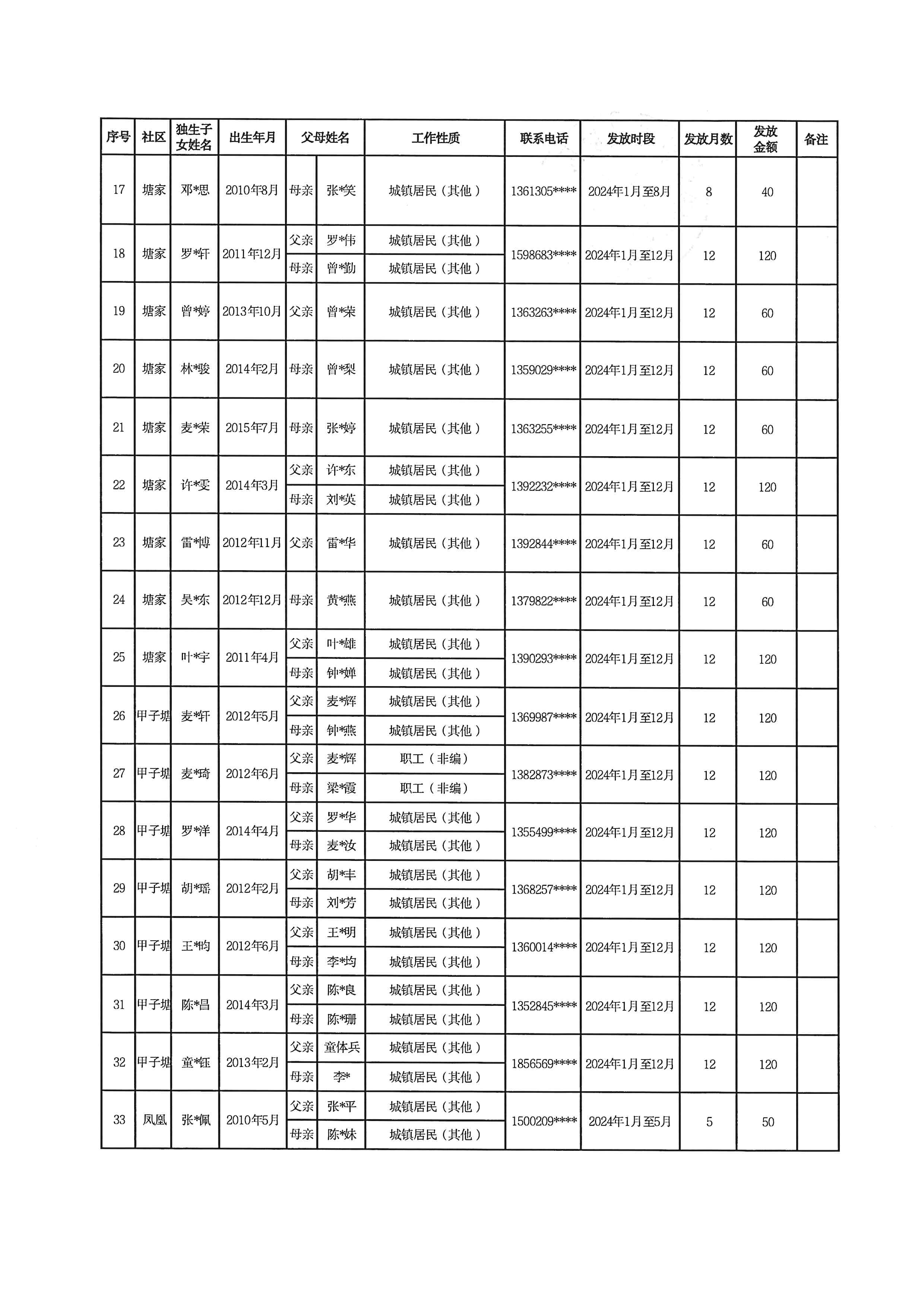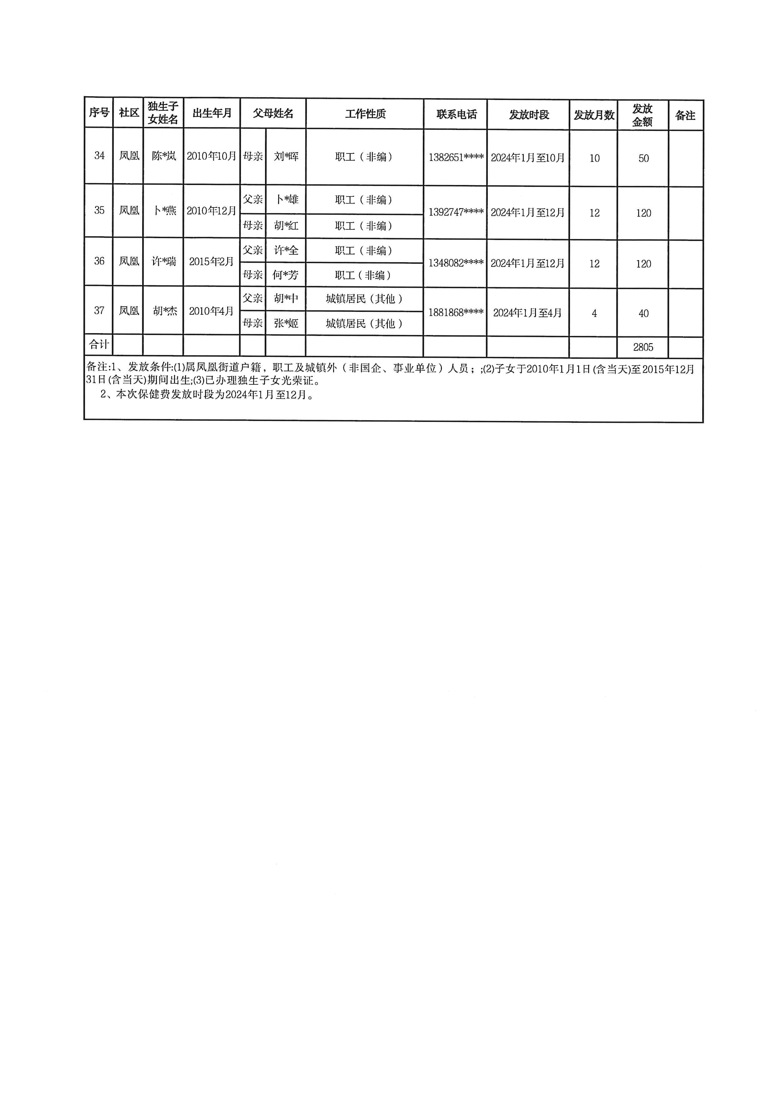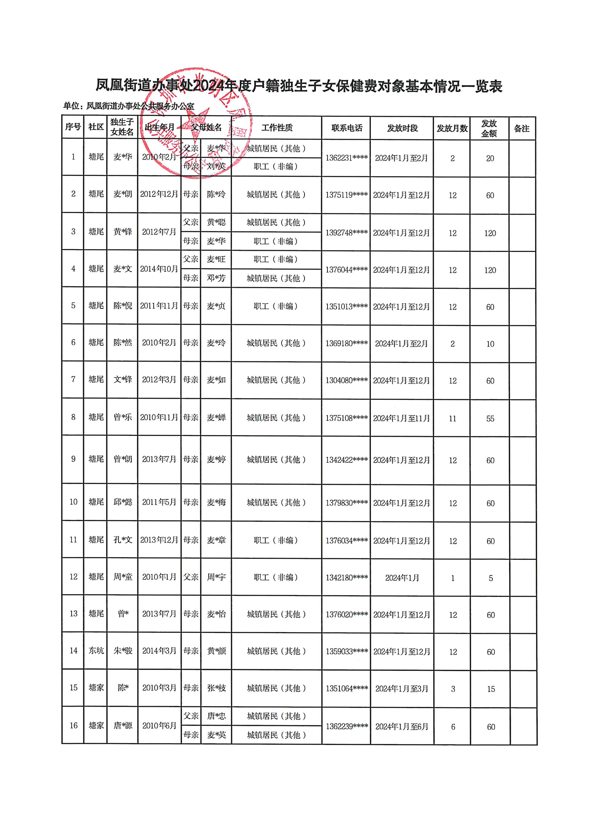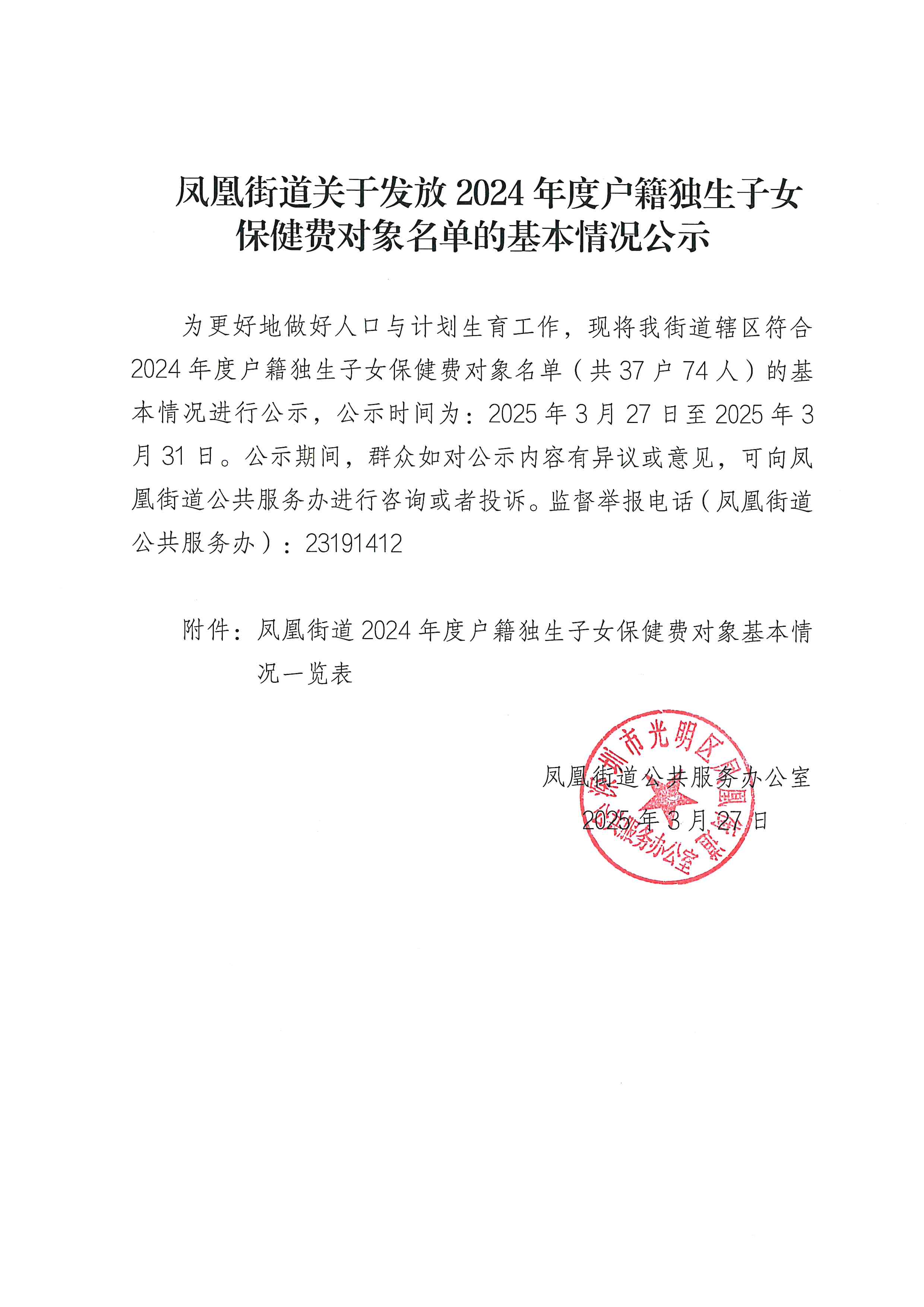 凤凰街道关于发放2024年度户籍独生子女保健费对象名单的基本情况公示