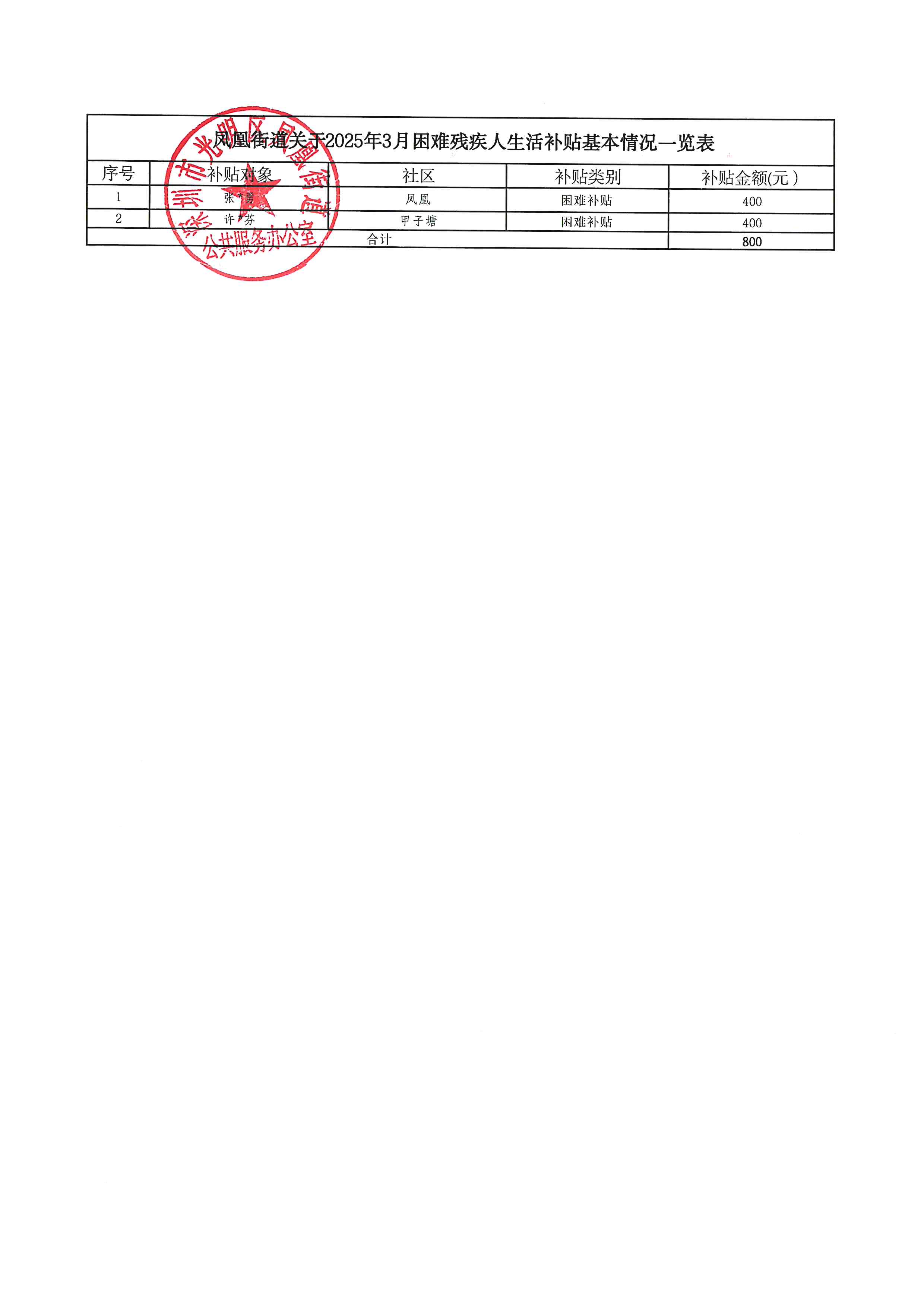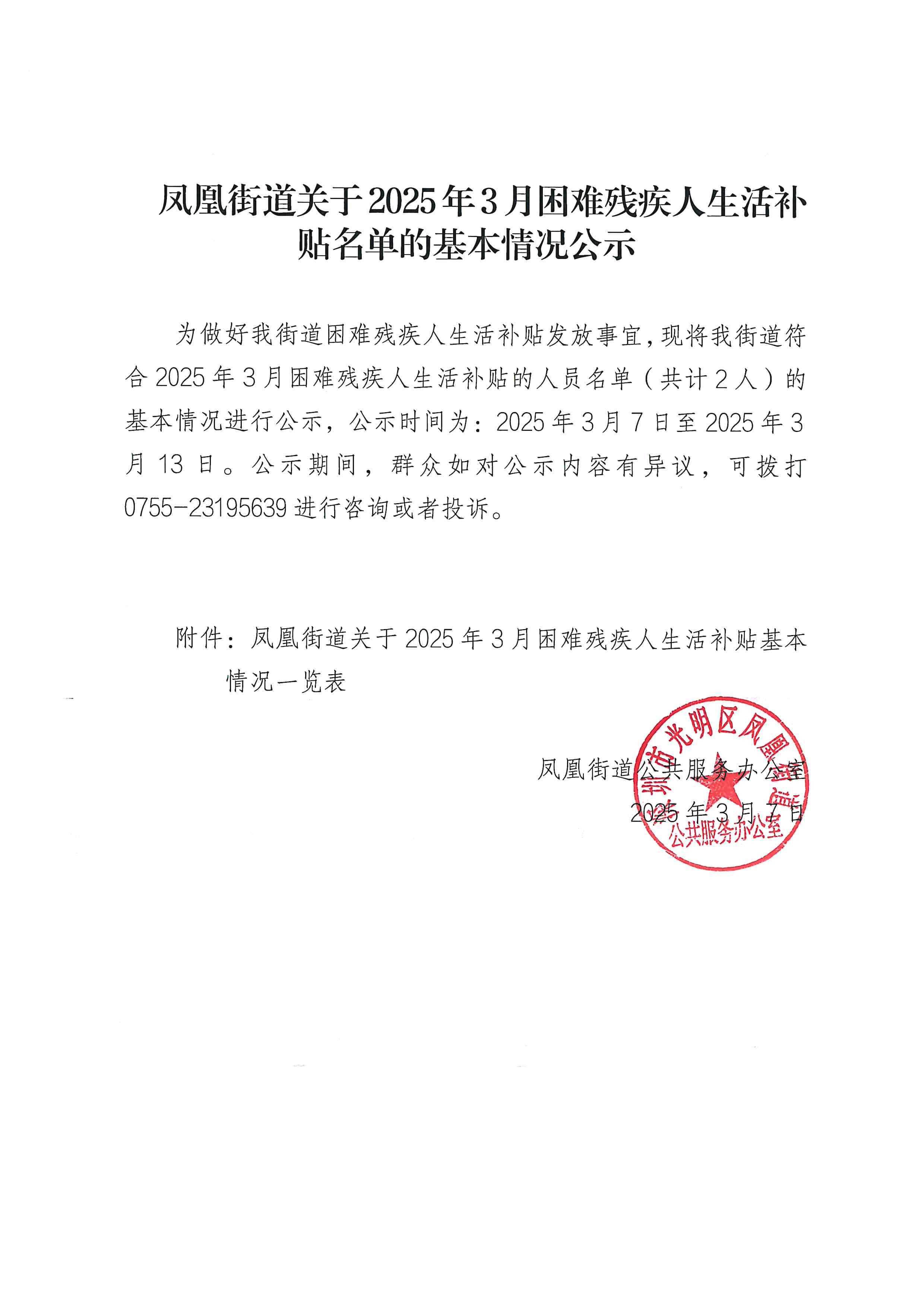 凤凰街道关于2025年3月困难残疾人生活补贴名单的基本情况公示