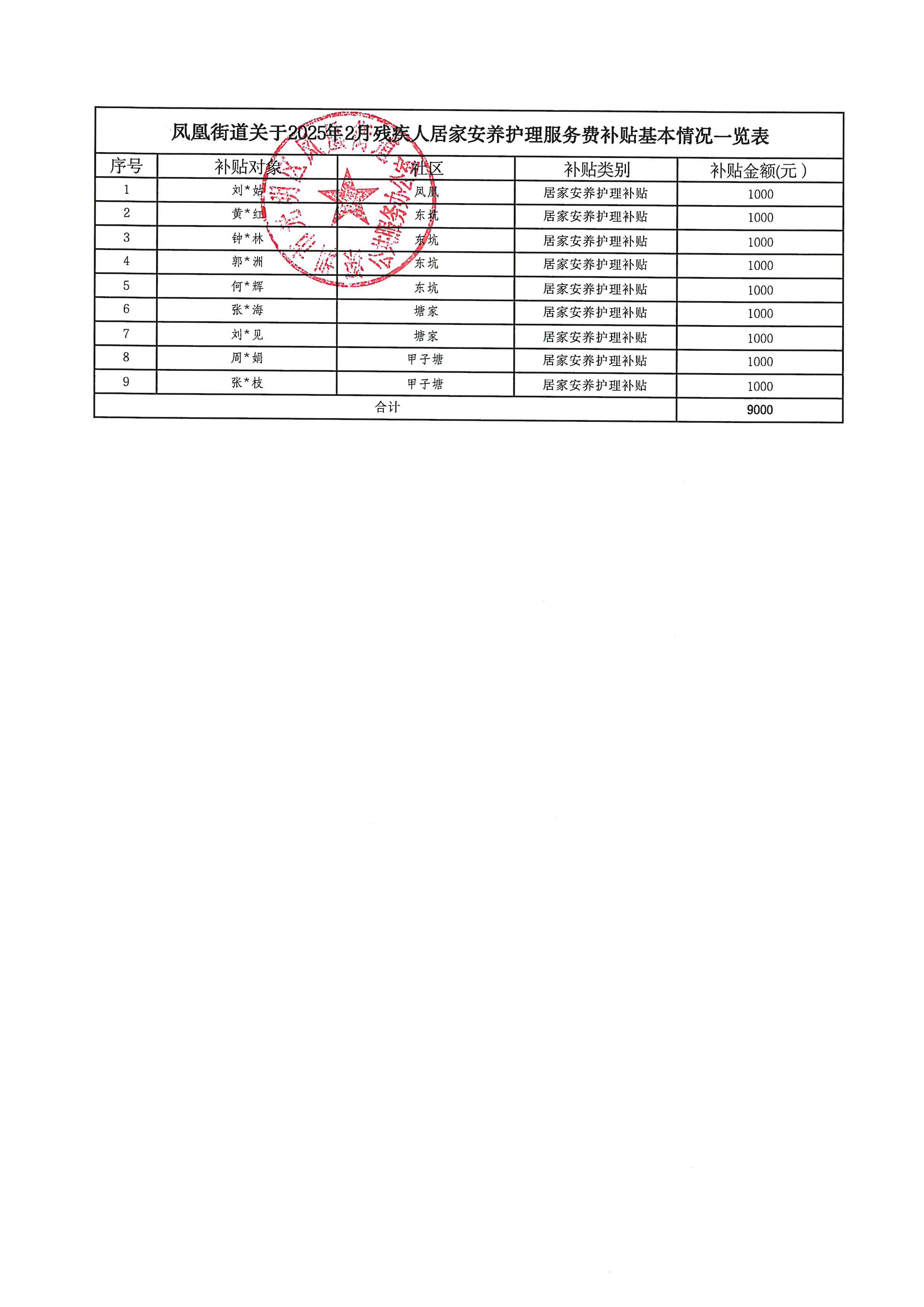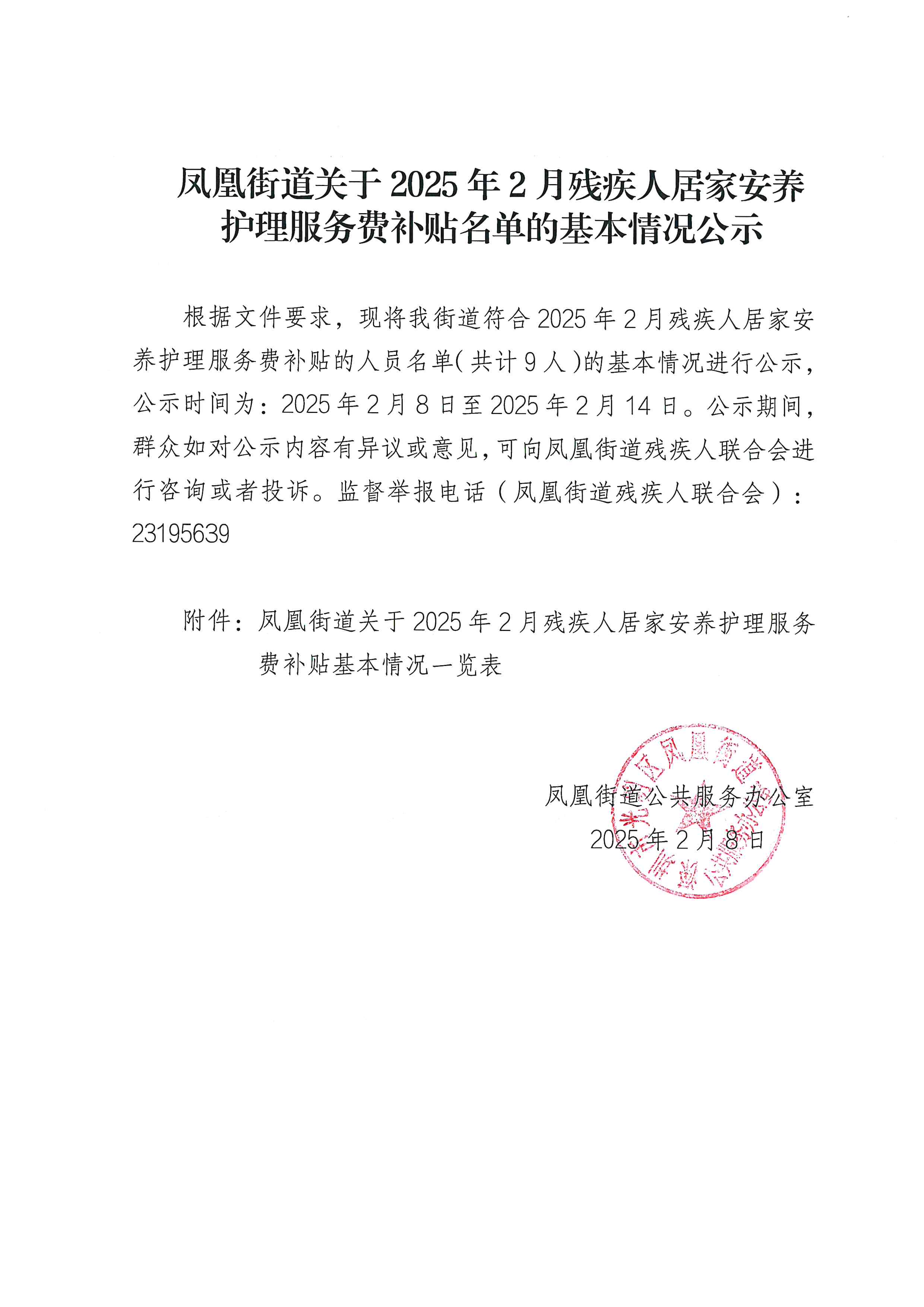 凤凰街道关于2025年2月残疾人居家安养护理服务费补贴名单的基本情况公示