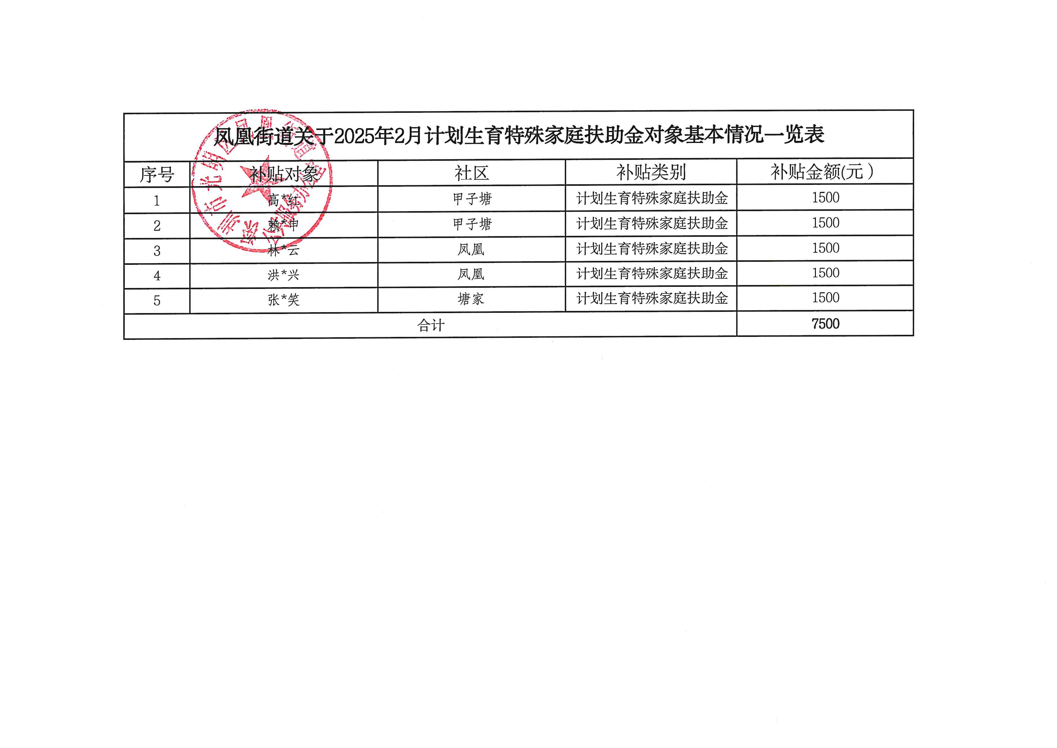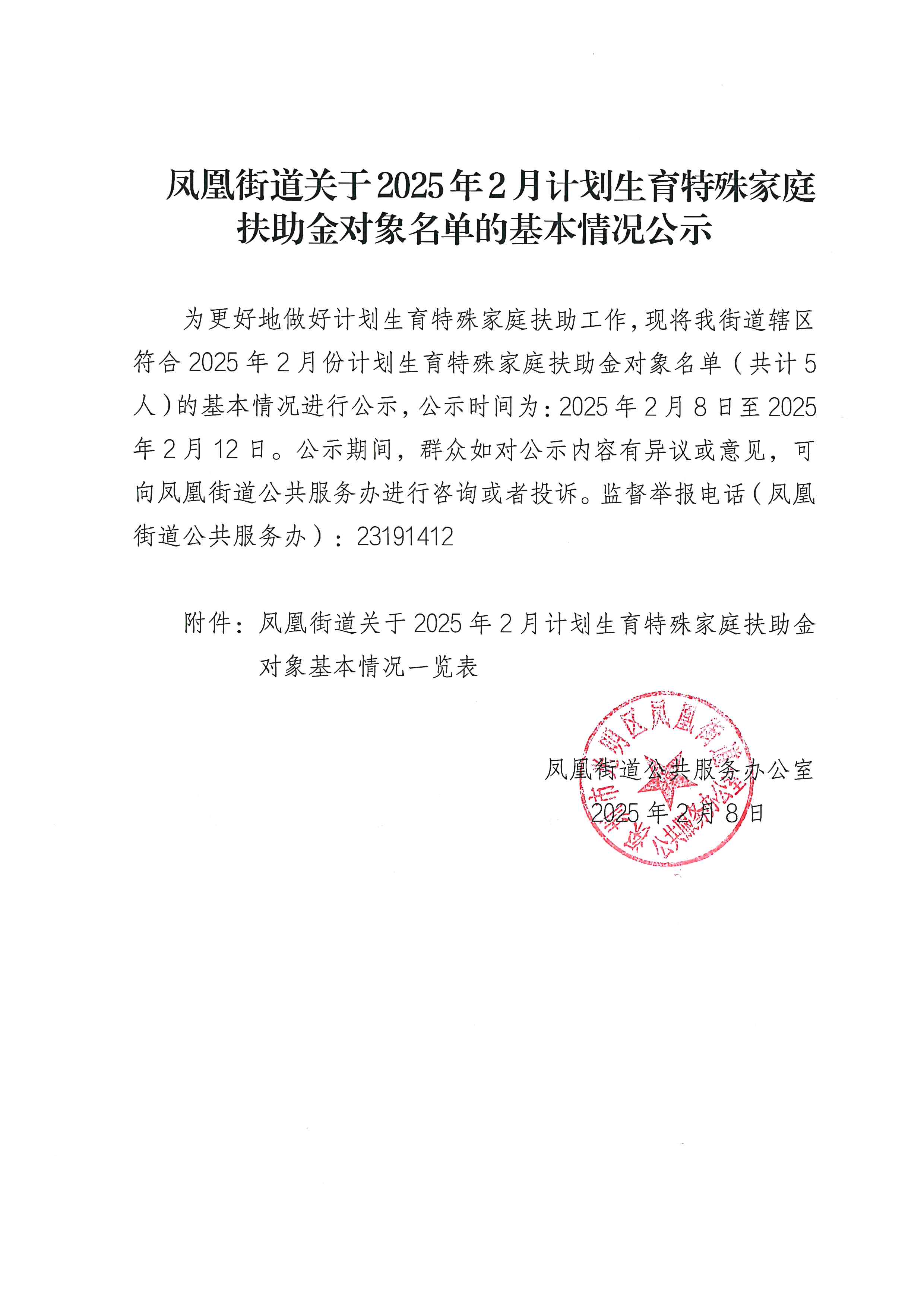 凤凰街道关于2025年2月计划生育特殊家庭 扶助金对象名单的基本情况公示