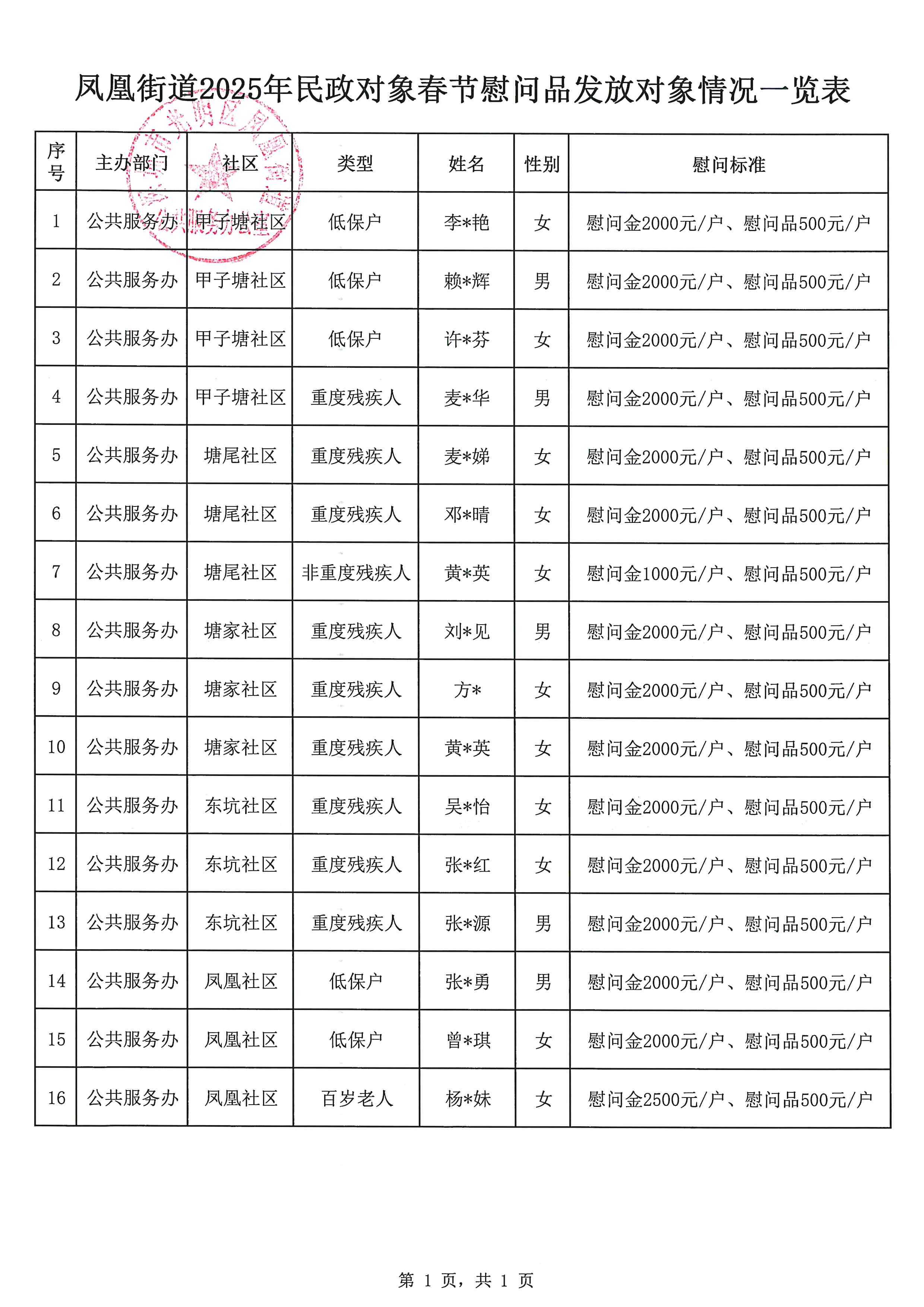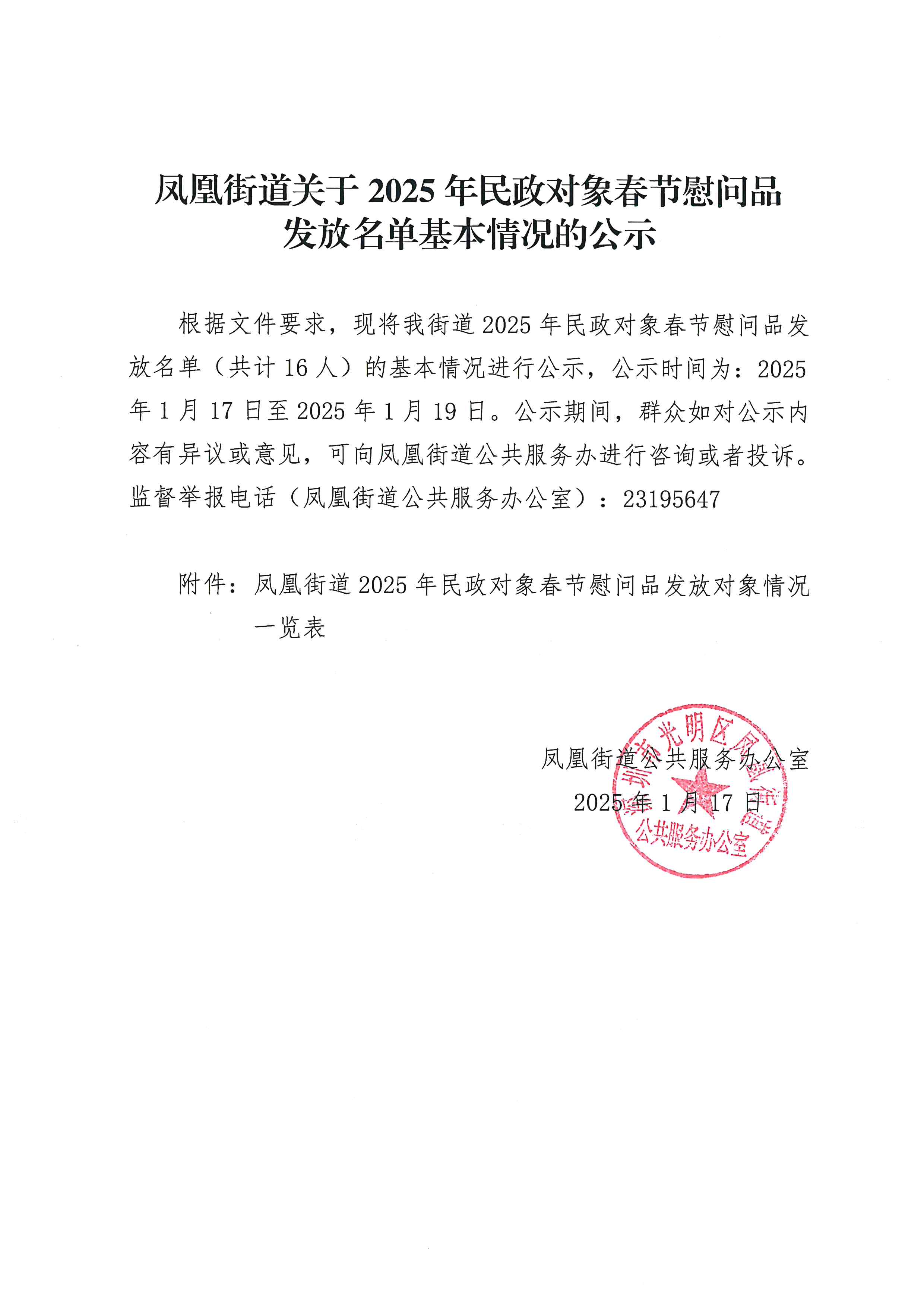 凤凰街道关于2025年民政对象春节慰问品发放名单基本情况的公示
