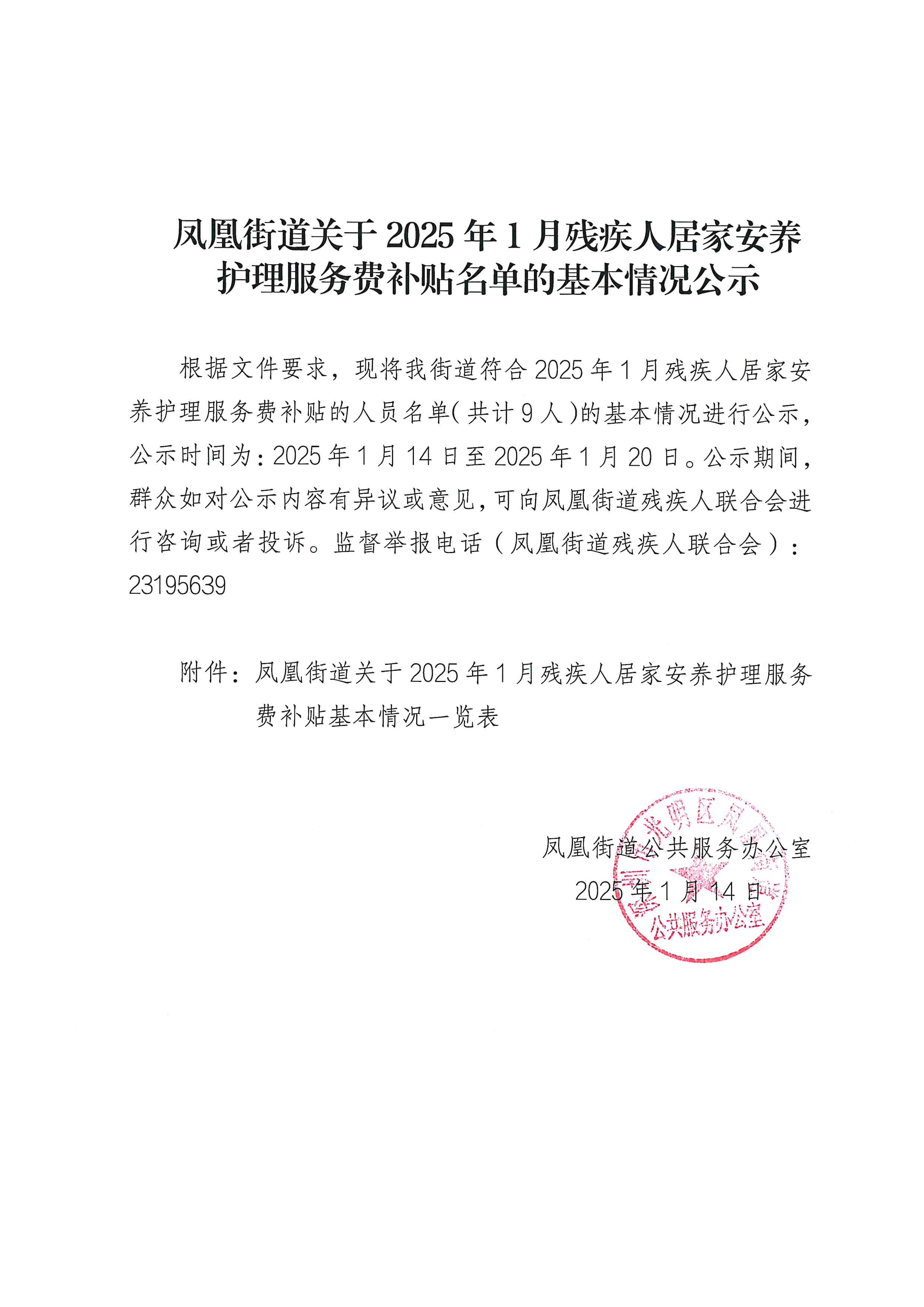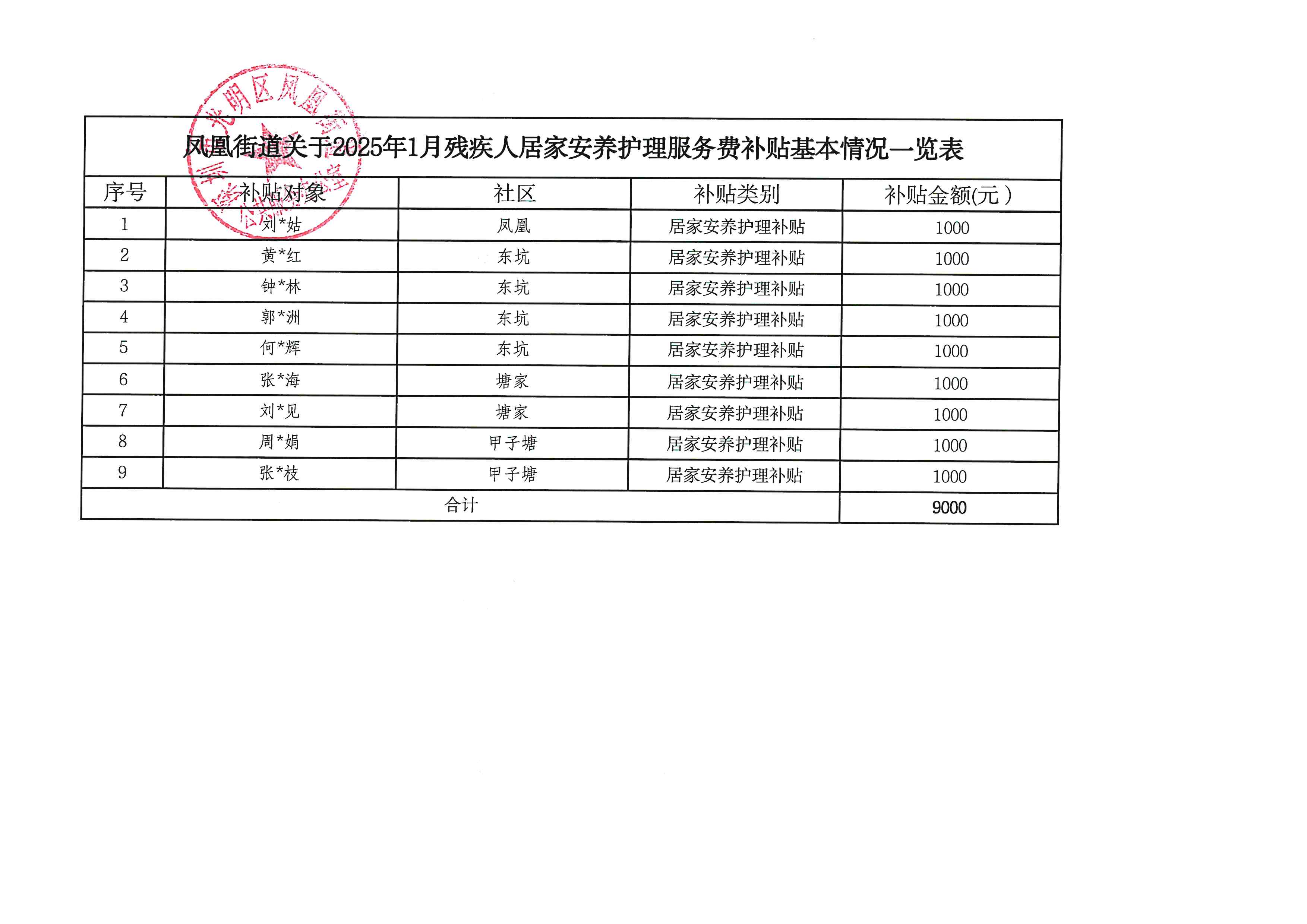 凤凰街道关于2025年1月残疾人居家安养护理服务费补贴名单的基本情况公示